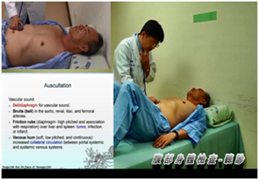 馬偕醫學系在107年首先錄製了醫學生四年級臨床技能課程,八大系統的身體檢查影音教學資料(心血管系統、呼吸系統、消化系統、內分泌及代謝、神經系統、耳鼻喉與頭頸部、骨骼肌肉系統、泌尿生殖系統共21部,每部6~12分鐘)。除了採用高畫質攝影之外更添加了影片後製(圖1),讓醫學生在觀看影片示範的同時也知道教學重點的詳細內容(圖2)。學生們觀看後覺得,能重複的播放影片幫助很大,除了能加深記憶之外,看到實際操作的各種細節有助於他們在練習時,徹底的執行每一個步驟。也有人反映知道了如何接觸病人,心情上比較不會緊張,也能真的從身體檢查的結果跟疾病表現做連結。從108年錄製完成到現在已經有6年的上線時間,前5個系統的影音教學資料,觀看點閱人數每一部都有1萬人次以上。連結網址:http://3606.ecw.mmh.org.tw/km/1092